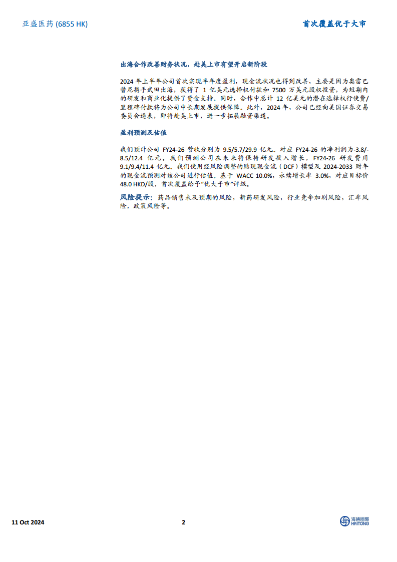 - 财务改善与战略布局: 与武田制药的BD交易不仅为公司带来了可观的现金流,使其在2024年上半年首次实现盈利,也验证了公司核心资产的全球价值。赴美上市的计划将进一步拓宽融资渠道,为公司未来的研发投入和商业化扩张提供长期保障。同时,公司其他在研管线,如APG-115、APG-1252、APG-2449和APG-5918,均聚焦于创新靶点,具备巨大的联用潜力和市场前景,为公司提供了多元化的增长点。尽管面临药品销售、研发、竞争、汇率和政策等多重风险,但亚盛医药凭借其强大的创新能力和全球化布局,有望在未来实现持续增长和价值创造。
