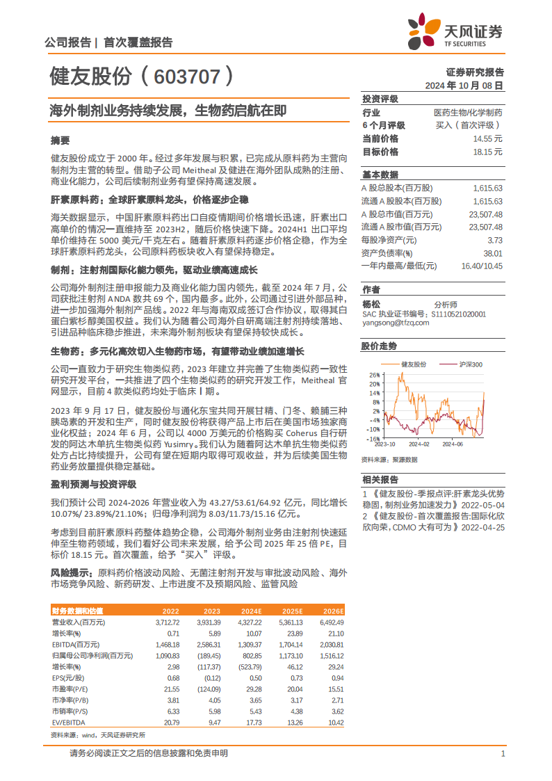报告核心观点指出,健友股份的增长引擎已从单一的肝素原料药扩展至多元化的制剂和生物药领域。肝素原料药业务在全球龙头地位稳固,价格逐步企稳,为公司提供稳定的现金流。同时,海外注射剂业务的持续发展和生物类似药的战略布局,特别是通过收购和合作切入阿达木单抗和胰岛素等重磅生物药市场,有望显著提升公司的成长天花板。鉴于公司在国际化方面的领先优势和多元化业务的协同效应,报告首次覆盖给予“买入”评级,并设定目标价格为18.15元,显示出对公司未来发展的强烈看好。