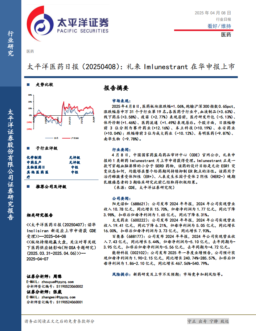 本报告核心观点指出,2025年4月8日,中国医药板块整体表现相对承压,跑输大盘,但细分领域呈现结构性分化,部分子行业如血液制品、线下药店和疫苗表现突出。同时,行业创新驱动力强劲,礼来(Eli Lilly)的1类新药Imlunestrant在华申报上市,预示着乳腺癌治疗领域的新进展。