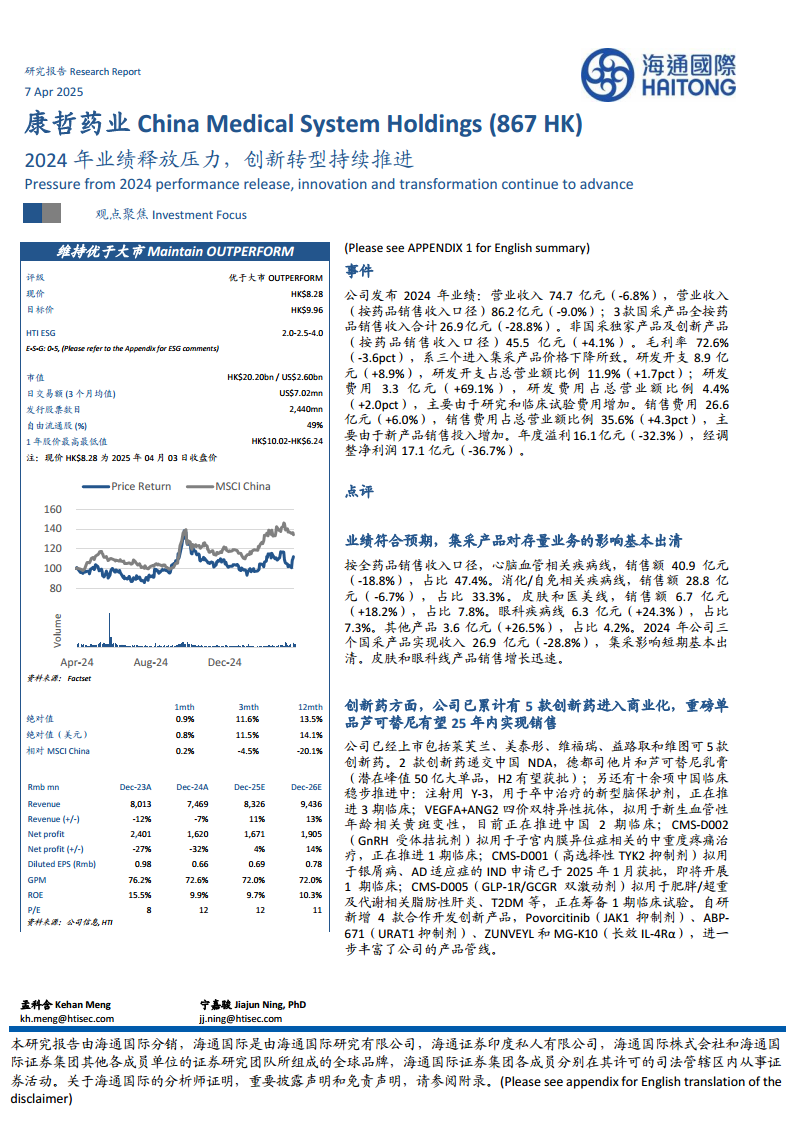 康哲药业2024年业绩受到国家集采政策的显著影响,导致营收和净利润短期内承压。然而,公司通过持续加大研发投入和积极推进创新药管线,展现出向创新驱动型企业转型的坚定决心。尽管短期业绩面临挑战,但非集采独家产品及创新产品的稳健增长,以及丰富的创新药储备和商业化进展,为公司未来发展奠定了基础,市场对其长期增长潜力持“优于大市”的积极评价。