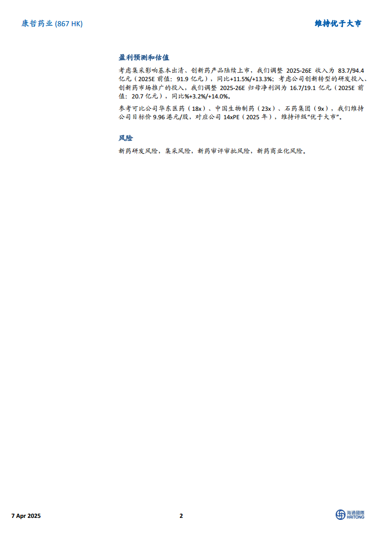 参考可比公司华东医药(18x)、中国生物制药(23x)、石药集团(9x)的估值,海通国际维持康哲药业目标价9.96港元/股,对应2025年14x PE,并维持“优于大市”的评级。