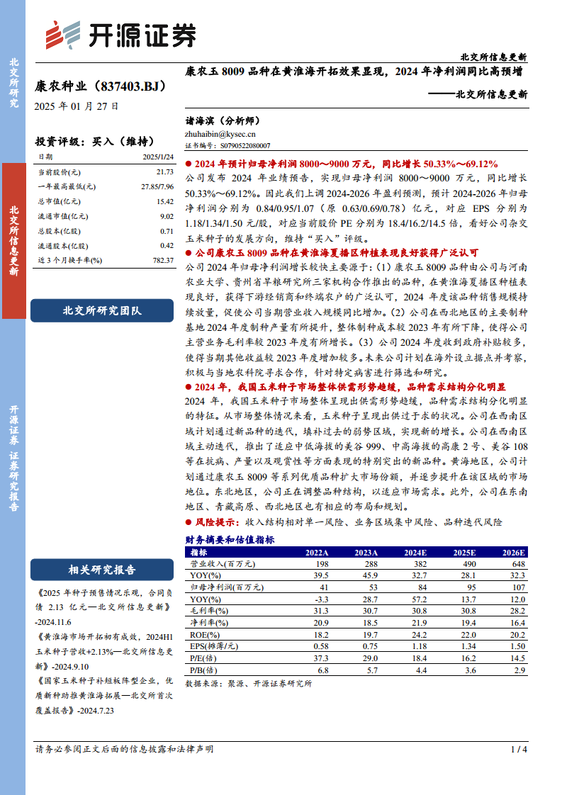 康农种业在2024年取得了显著的业绩突破,预计归母净利润实现大幅增长,主要得益于其核心品种康农玉8009在黄淮海市场的成功推广和销售放量。公司通过优化制种成本、获得政府补贴以及积极规划海外市场,有效提升了盈利能力。面对玉米种子市场供需结构的变化,康农种业积极调整区域战略,在西南地区通过新品种迭代寻求增长,在黄淮海地区巩固市场份额,并在其他区域进行战略布局,展现出清晰的市场拓展路径。尽管存在收入结构单一、业务区域集中和品种迭代等风险,但公司强劲的财务表现和积极的战略部署,使得开源证券对其未来发展持乐观态度,并维持“买入”评级。