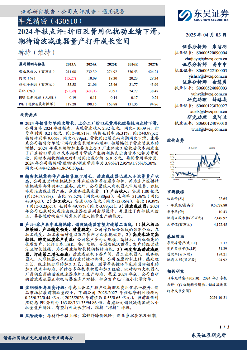 丰光精密2024年业绩受到上合工厂折旧及费用化、政府补助减少等因素的短期扰动,导致归母净利润同比下滑40.81%,但营业收入仍实现10.09%的增长。公司在精密机械零部件主业上保持稳健,产品收入同比增长17.78%。更重要的是,公司在人形机器人市场趋势下积极布局的谐波减速器业务已取得突破性进展,成功完成技术验证并进入小批量量产阶段,有望成为未来业绩增长的强大驱动力。尽管分析师下调了未来三年的盈利预测,但考虑到谐波减速器业务的巨大成长潜力,报告维持了“增持”评级,表明对公司长期发展的信心。投资者需关注原材料价格波动、零部件降价及新业务拓展进度等潜在风险。