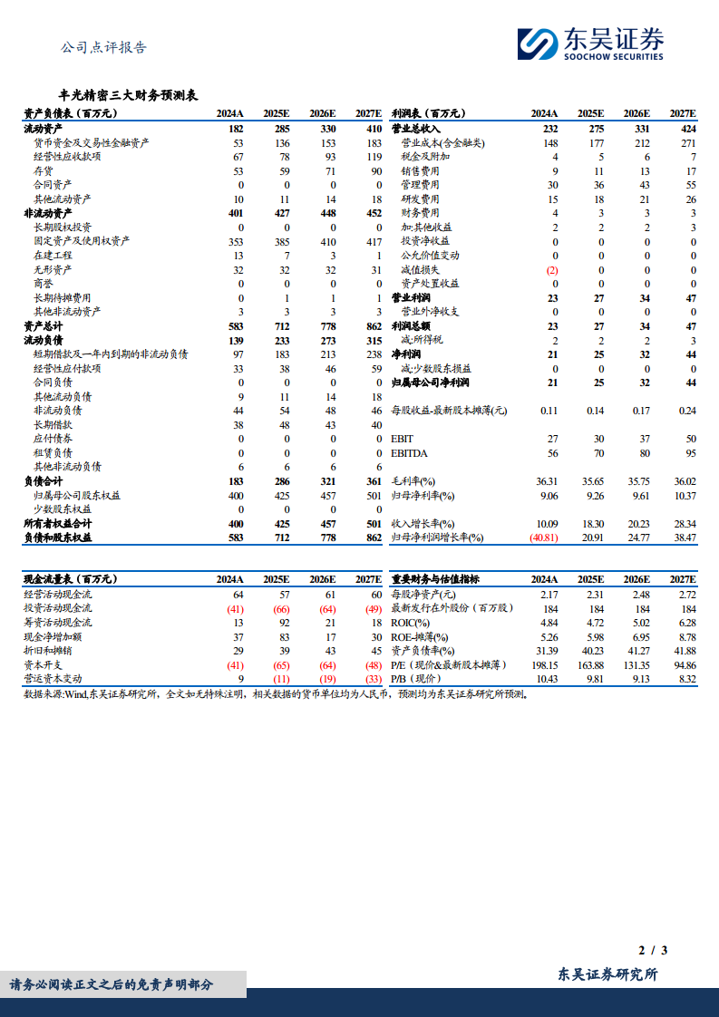 基于上合工厂投产带来的折旧及费用化水平提升,以及新品市场拓展前期放量较小的考量,分析师下调了公司2025-2027年的归母净利润预测,分别为0.25亿元、0.32亿元和0.44亿元(原预测2025/2026年为0.55/0.65亿元)。尽管如此,报告维持了“增持”评级,主要基于公司谐波减速器业务进入小批量量产阶段,有望打开新的成长空间。 根据最新的盈利预测,公司2024-2027年的营业总收入预计将从2.32亿元增长至4.24亿元,归母净利润预计将从2024年的0.21亿元增长至2027年的0.44亿元,年复合增长率显著。毛利率预计在35.65%至36.02%之间波动,归母净利率预计将从9.06%提升至10.37%。当前股价对应的动态P/E分别为198.15倍(2024A)、163.88倍(2025E)、131.35倍(2026E)和94.86倍(2027E)。 报告同时提示了原材料价格上涨、零部件降价以及新业务拓展不及预期的风险。