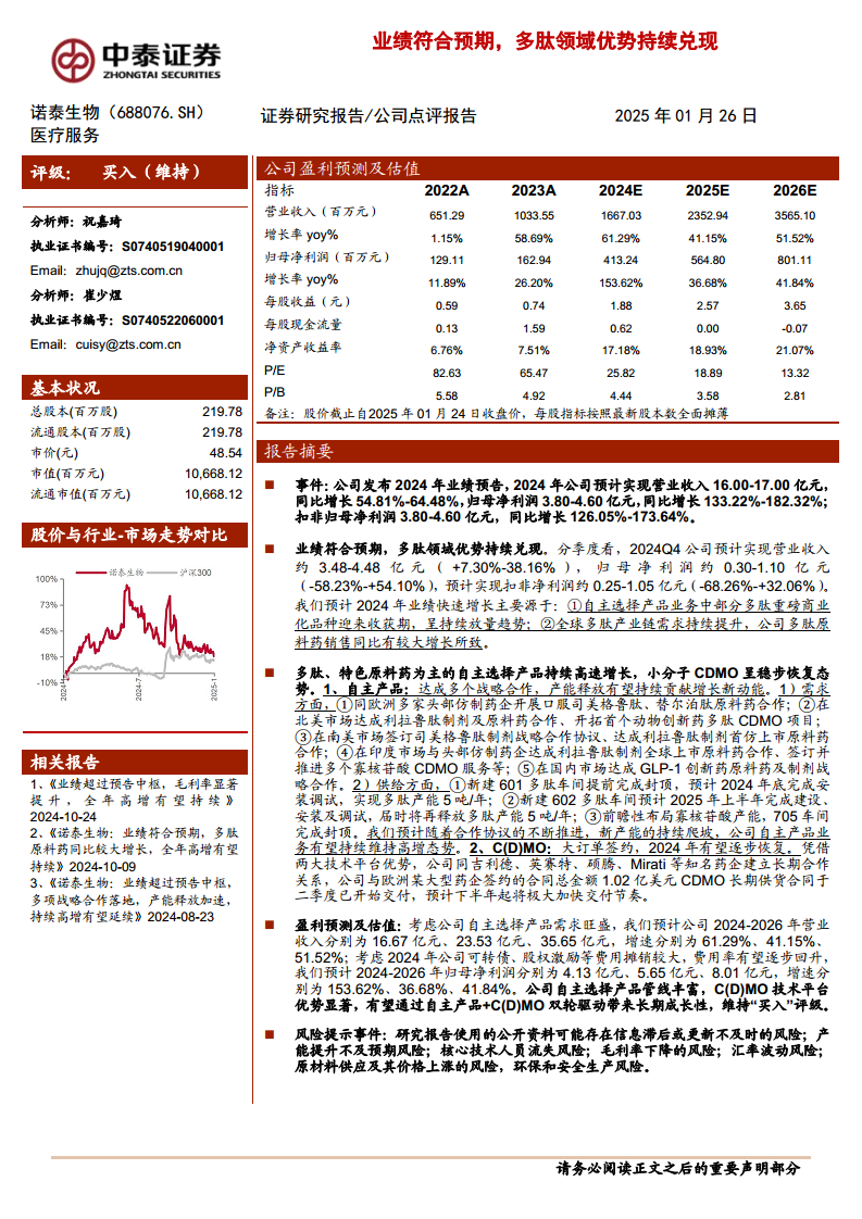 诺泰生物2024年业绩符合预期,主要得益于多肽领域自主选择产品的持续放量和全球多肽产业链需求的增长。公司通过与全球知名药企的战略合作,以及新建多肽和寡核苷酸车间,显著提升了产能,为自主产品业务的持续高增长奠定了基础。同时,小分子CDMO业务也凭借大订单签约呈现稳步恢复态势。展望未来,公司有望通过“自主产品+C(D)MO”双轮驱动实现长期成长,维持“买入”评级。然而,投资者仍需关注产能提升、核心技术人员流失、毛利率波动以及汇率等潜在风险。