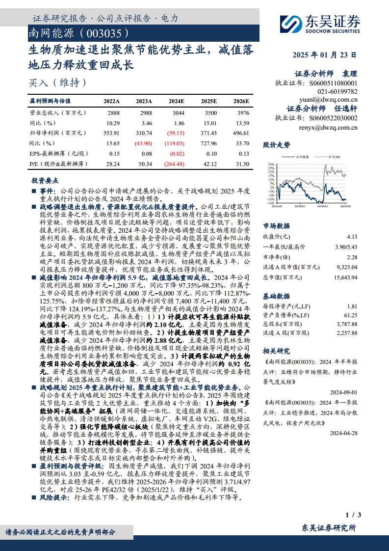 南网能源正通过战略性退出生物质综合利用业务,以解决其长期亏损问题并优化资产结构。尽管2024年因生物质资产减值导致公司归母净利润出现亏损(预计4,000万元–8,000万元,减值总额约5.9亿元),但此举被视为一次性压力释放,有助于提升未来报表质量。公司已明确2025年战略规划,将重心聚焦于建筑节能和工业节能两大优势主业,并积极拓展多能协同、碳服务、科技创新及并购重组等领域,以实现可持续增长。分析师维持公司“买入”评级,并预测其在2025-2026年将重回盈利增长轨道,归母净利润分别达到3.71亿元和4.97亿元。