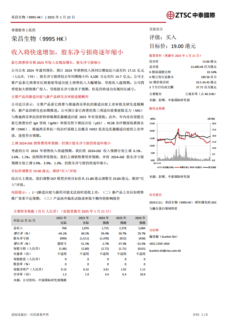 荣昌生物(09995):收入将快速增加,股东净亏损将逐年缩小