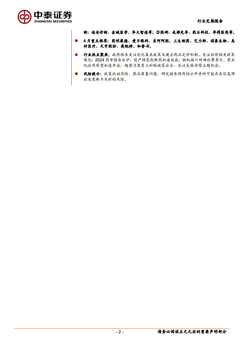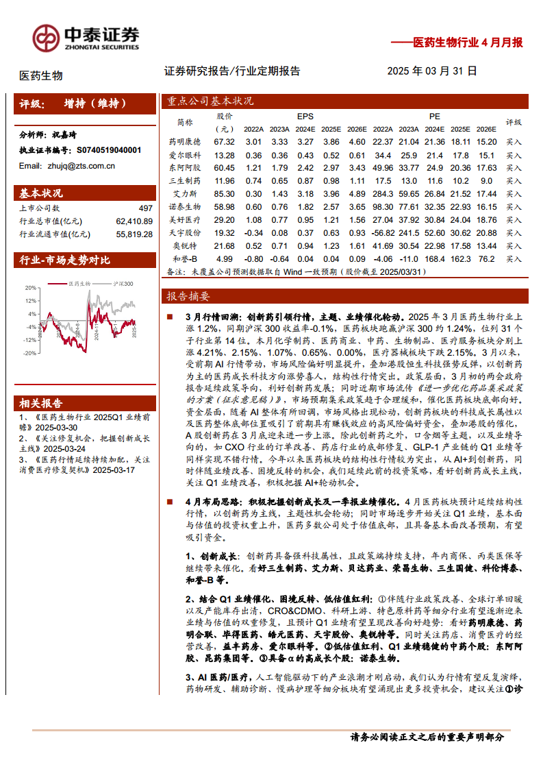 中泰医药4月重点推荐组合包括药明康德、爱尔眼科、东阿阿胶、三生制药、艾力斯、诺泰生物、美好医疗、天宇股份、奥锐特、和誉-B。该组合在3月平均涨幅达10.02%,跑赢医药生物行业8.85%,其中和誉-B (+40.63%)、荣昌生物 (+25.69%)、药明康德 (+10.13%)、诺泰生物 (+9.24%)、艾力斯 (+8.86%) 表现亮眼。
