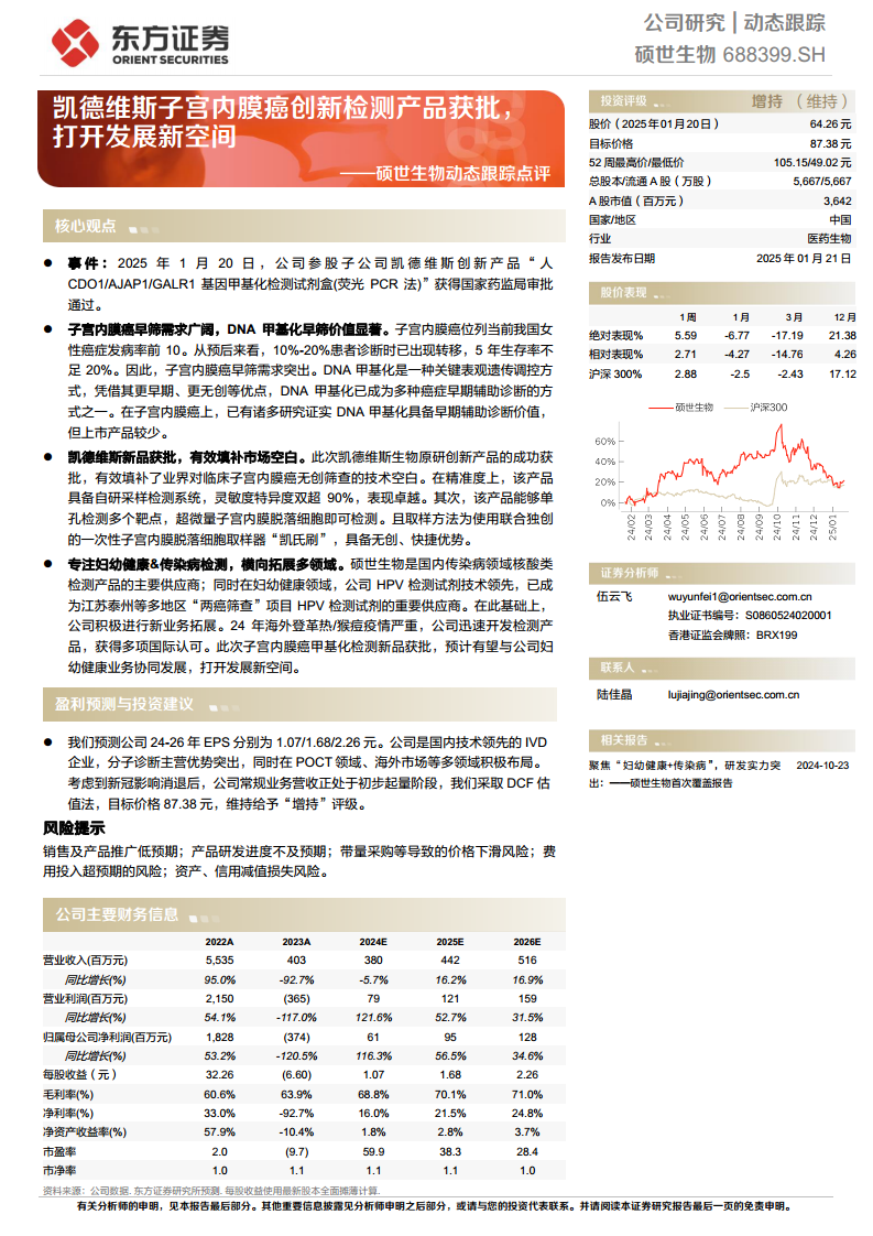 硕世生物凭借其参股子公司凯德维斯生物在子宫内膜癌早筛领域的创新突破,成功获批“人CDO1/AJAP1/GALR1 基因甲基化检测试剂盒”,有效填补了市场空白,并展现出卓越的技术优势和广阔的市场前景。该产品将与公司在妇幼健康及传染病检测领域的现有业务形成协同,为公司打开新的增长空间。尽管公司在2023年面临业绩挑战,但随着常规业务的恢复和新产品的推动,预计未来盈利能力将稳步提升。东方证券研究所维持公司“增持”评级,目标价格87.38元,反映了对公司长期发展潜力的认可。然而,投资者仍需关注销售推广、研发进度、政策变化及费用控制等潜在风险。