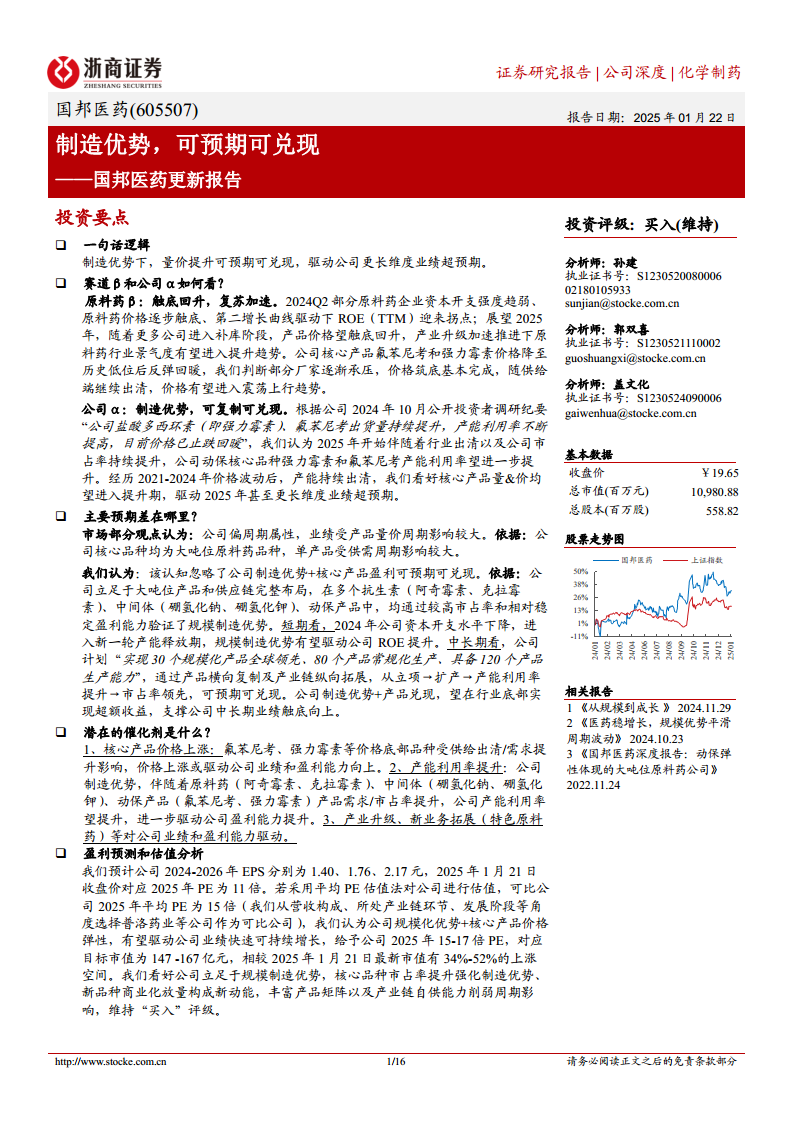 本报告的核心观点在于,国邦医药凭借其深厚的规模化制造优势,有望在原料药行业触底回升的背景下,实现核心产品量价齐升,进而驱动公司业绩在更长维度上超预期增长。市场普遍认为公司具有周期性属性,但报告强调,公司通过其完善的供应链布局、高市占率以及稳定的盈利能力,已验证了其规模制造优势,这使得其核心产品盈利能力具备可预期和可兑现性,从而平滑了周期波动,并有望在行业底部实现超额收益。