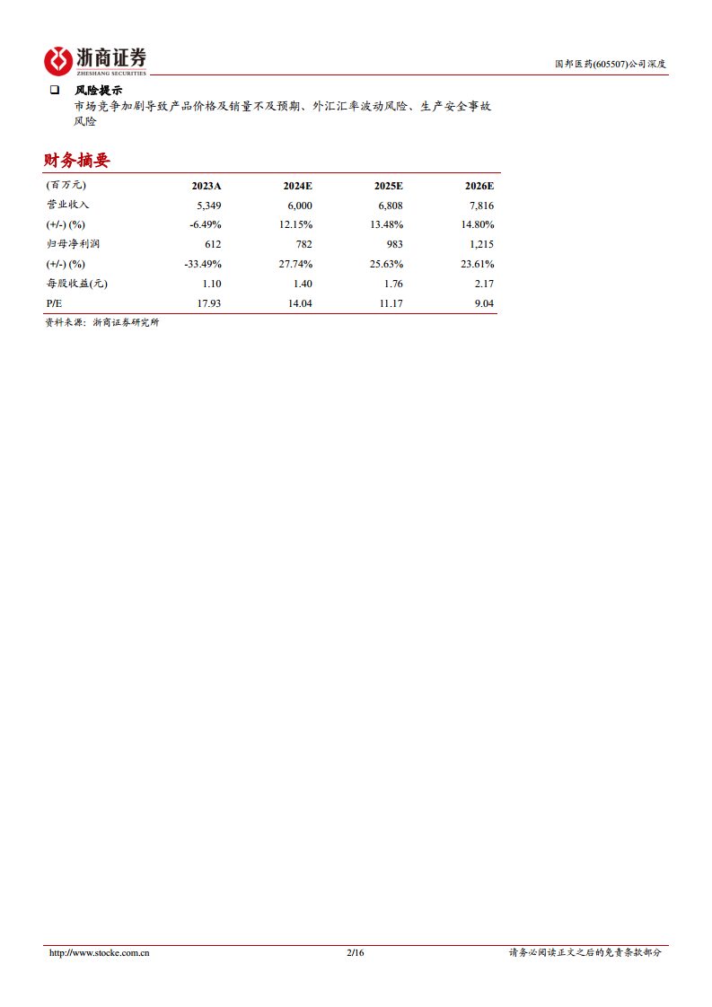 报告特别指出,市场对公司“周期性”的认知存在预期差,忽略了公司制造优势带来的盈利可预期和可兑现性。随着公司大规模资本开支的完成,其核心动保产品如氟苯尼考和强力霉素的产能利用率持续提升,价格已止跌回暖,预计将成为未来业绩增长的关键驱动力。公司2024-2026年的盈利预测显示出强劲的增长潜力,且估值具备吸引力,报告维持“买入”评级,并预计公司股价有显著上涨空间。同时,报告也提示了市场竞争、汇率波动和生产安全等潜在风险。总体而言,国邦医药被视为一家在行业底部具备超额收益能力,并有望实现中长期业绩触底向上的优质企业。
