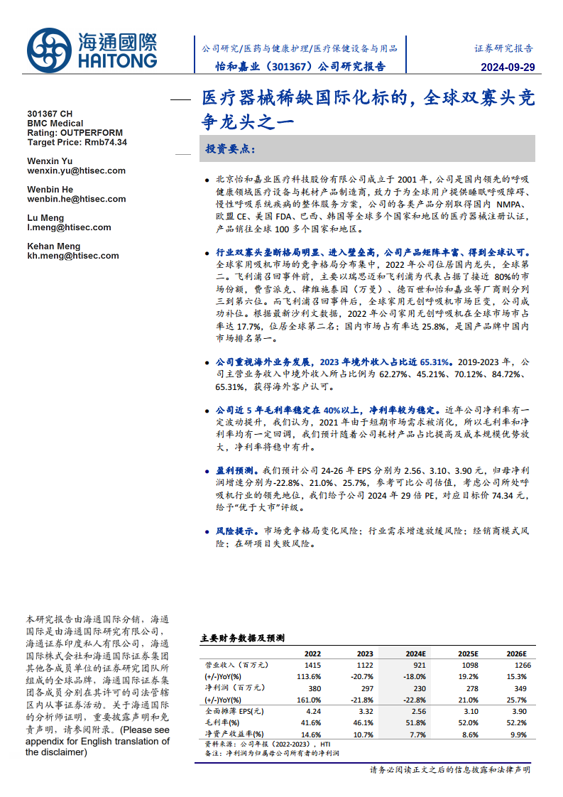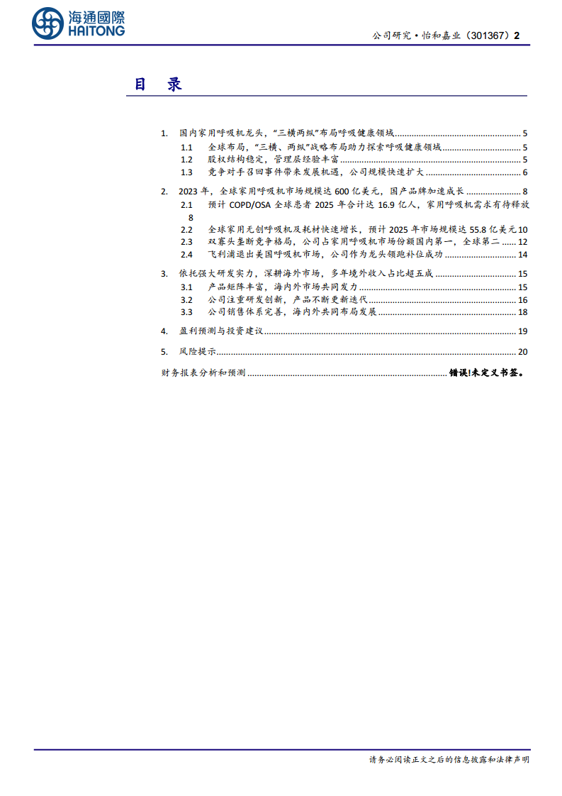 怡和嘉业作为国内呼吸健康领域的领军企业,凭借其前瞻性的“三横两纵”战略布局、持续的研发创新和深耕海外市场的策略,在全球家用无创呼吸机市场中占据了显著地位。尤其在飞利浦召回事件后,公司成功抓住市场机遇,迅速提升了全球和国内市场份额,成为行业双寡头竞争格局中的重要一员。面对全球COPD和OSA患者数量的持续增长以及家用呼吸机及耗材市场的快速扩张,怡和嘉业有望凭借其丰富的产品矩阵、完善的销售体系和稳健的财务表现,持续实现盈利增长。尽管存在市场竞争、需求增速放缓等风险,但公司在创新和国际化方面的优势使其具备较强的抗风险能力和增长潜力,未来发展前景广阔。
