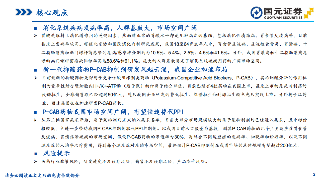 中国消化系统疾病患者基数庞大,为抑酸药物市场提供了广阔空间。P-CAB抑制剂凭借其优越的作用机制和临床疗效,正逐步取代传统PPI药物,成为抑酸治疗的新主流。在国家集采政策推动PPI降价的背景下,中国药企加速P-CAB的研发与市场布局,多款国产P-CAB药物已上市或处于临床后期,预计P-CAB抑制剂市场规模将突破200亿元,展现出巨大的增长潜力。然而,医药行业政策、产品降价、研发进度不及预期以及销售不及预期等风险仍需持续关注。
