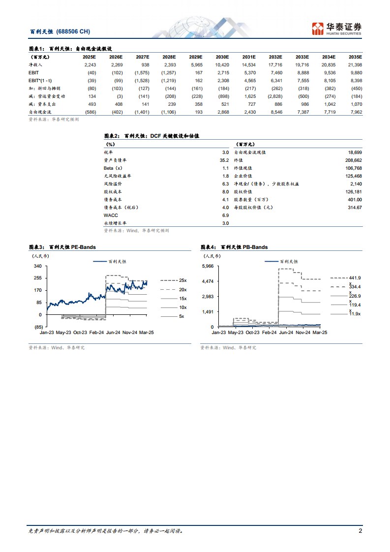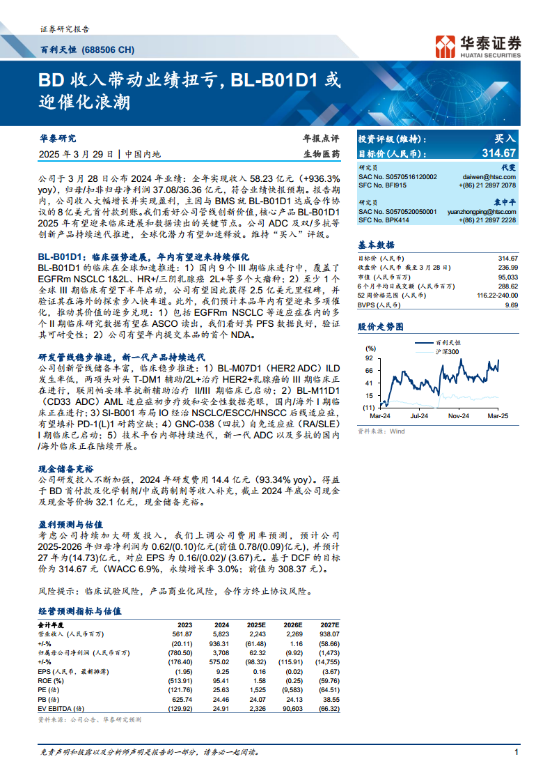 考虑到公司持续高强度的研发投入,华泰研究上调了公司的费用率预测。据此,预计公司2025-2026年归母净利润分别为0.62亿元和(0.10)亿元(前值分别为0.78亿元和(0.09)亿元),并预计2027年归母净利润为(14.73)亿元,对应每股收益(EPS)分别为0.16元、(0.02)元和(3.67)元。尽管短期盈利预测有所调整,但华泰研究维持了对百利天恒的“买入”投资评级。基于DCF(现金流折现)模型,目标价上调至314.67元人民币(WACC为6.9%,永续增长率为3.0%),较前值308.37元有所提升,反映了市场对公司长期创新价值的认可。报告同时提示了临床试验风险、产品商业化风险以及合作方终止协议风险。