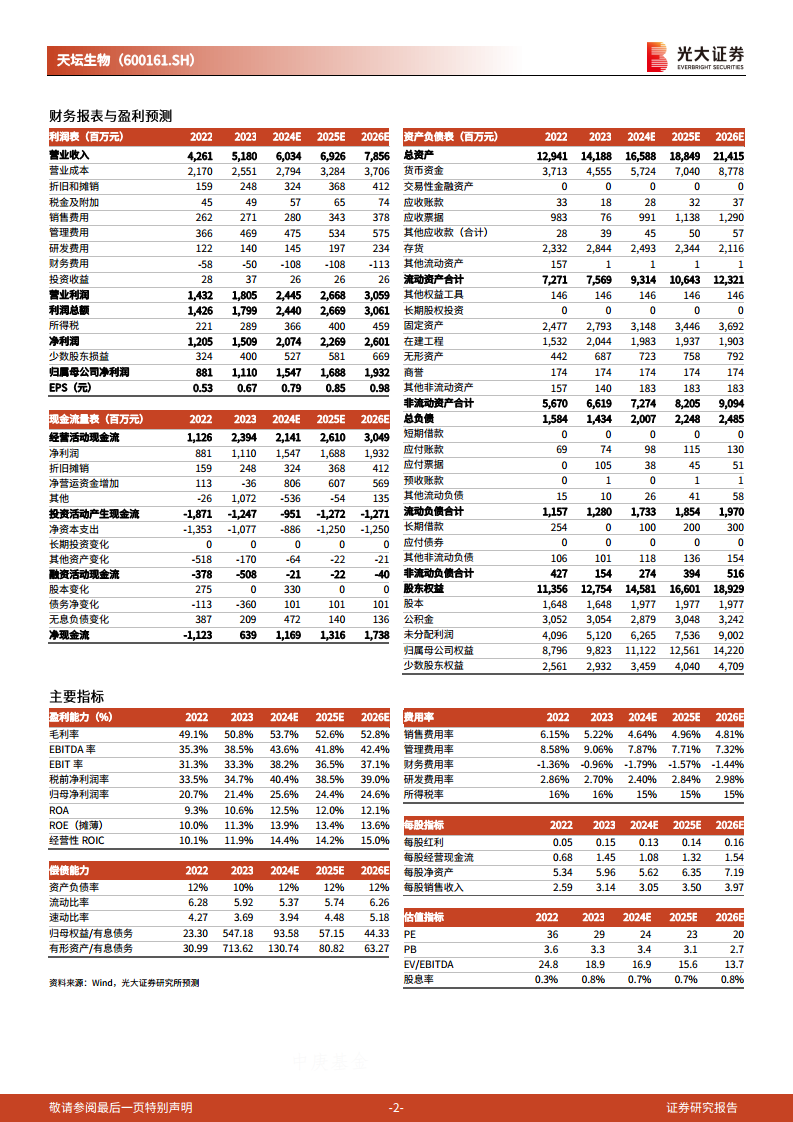 通过对公司盈利预测与估值简表、利润表、资产负债表和现金流量表等财务数据的分析,可以更全面地了解天坛生物的财务健康状况和运营效率。