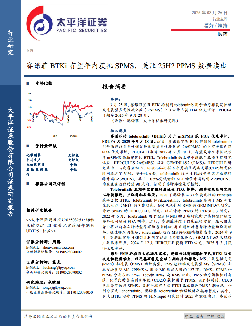 本报告分析了赛诺菲BTK抑制剂tolebrutinib在治疗非复发性继发进展型多发性硬化症(nrSPMS)方面的最新进展。该药物已获得FDA优先审评,PDUFA日期为2025年9月28日,有望成为全球首款获批的脑穿透性BTKi,显著满足了nrSPMS患者的治疗需求。临床数据显示,tolebrutinib能有效延缓残疾进展31%,且肝毒性可控。报告同时强调了进展型多发性硬化症(PMS)领域巨大的未满足医疗需求,并展望了包括罗氏Fenebrutinib和诺诚健华奥布替尼在内的其他BTKi在PMS治疗中的发展前景。预计未来几年,随着这些创新疗法的上市和临床数据读出,MS治疗市场将迎来重要的变革和增长机遇,但新药研发和市场竞争风险仍需关注。