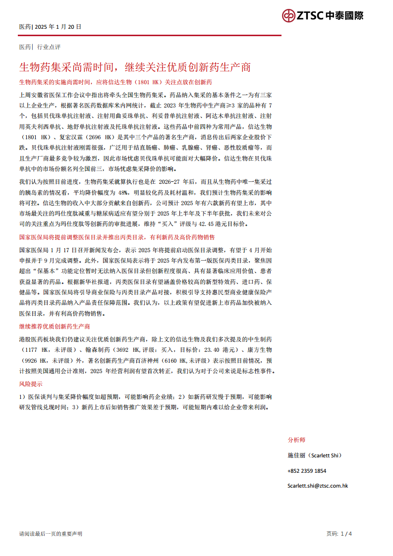 生物药集采尚需时间,继续关注优质创新药生产商