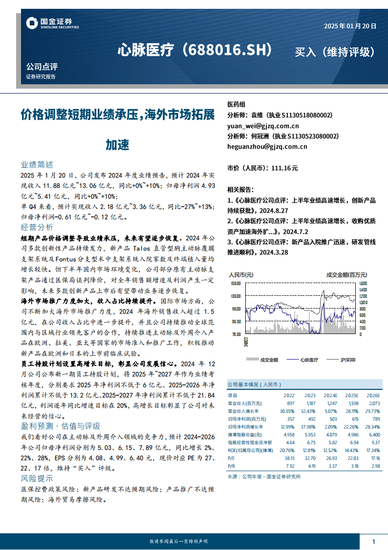 心脉医疗(688016):公司点评:价格调整短期业绩承压,海外市场拓展加速