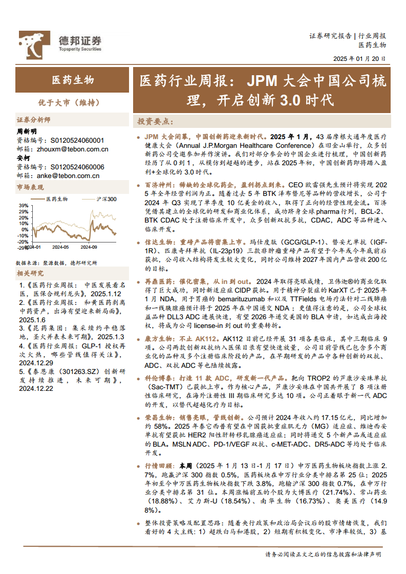 医药行业周报:JPM大会中国公司梳理,开启创新3.0时代