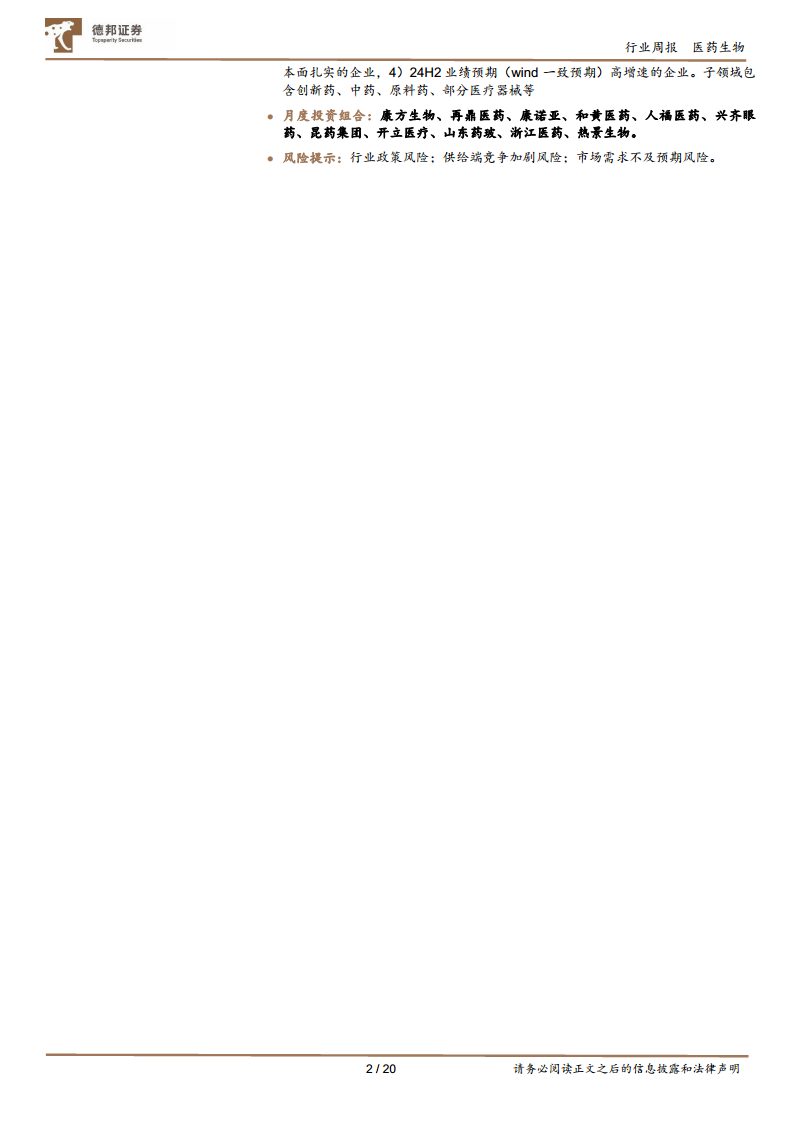 整体投资策略及配置思路建议关注四大主线:1)超跌白马和港股;2)短期有积极变化、市净率较低的企业;3)基本面扎实的企业;4)2024年下半年业绩预期(Wind一致预期)高增速的企业。子领域包含创新药、中药、原料药、部分医疗器械