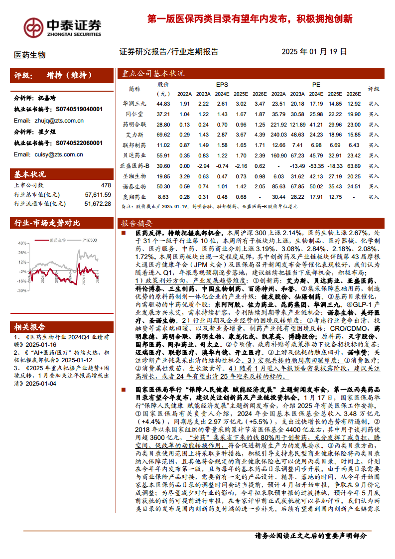 本周(截至2025年1月19日),沪深300指数上涨2.14%,医药生物板块表现强劲,上涨2.67%,在31个一级子行业中位列第10。所有医药子板块均实现上涨,其中生物制品、医疗器械、化学制药、医疗服务、中药和医药商业分别上涨3.19%、3.08%、2.84%、2.18%、2.08%和1.72%。创新药及产业链板块受摩根大通医疗健康年会和医保局新闻发布会等利好催化,表现尤为突出。报告建议投资者在年报悲观预期逐步落地后,继续把握当前底部机会,积极布局。