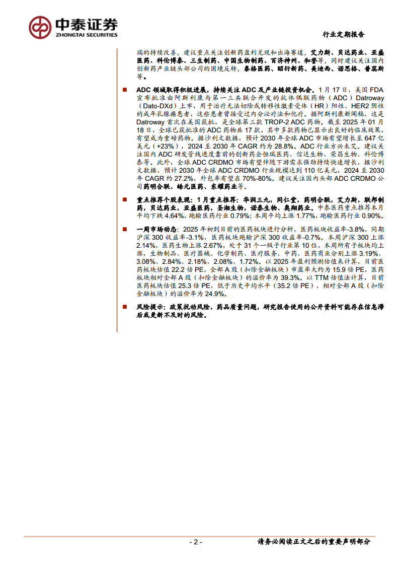 报告建议投资者把握当前市场底部机会,重点关注创新药、原料药制剂一体化、中药、GLP-1等政策利好和产业趋势明确的领域。同时,CRO/CDMO、原料药、医疗设备等经历困境反转的细分板块,以及消费医疗、疫苗等宏观共振的顺周期回暖领域也具备投资潜力。ADC药物领域在全球范围内取得积极进展,市场规模和CRDMO行业均呈现高速增长态势,为相关创新药企和外包服务公司带来广阔机遇。尽管医药板块估值低于历史平均水平,但仍需警惕政策扰动、药品质量及信息滞后等风险。整体而言,医药行业在政策引导和创新驱动下,正逐步走出低谷,迎来结构性投资机会。