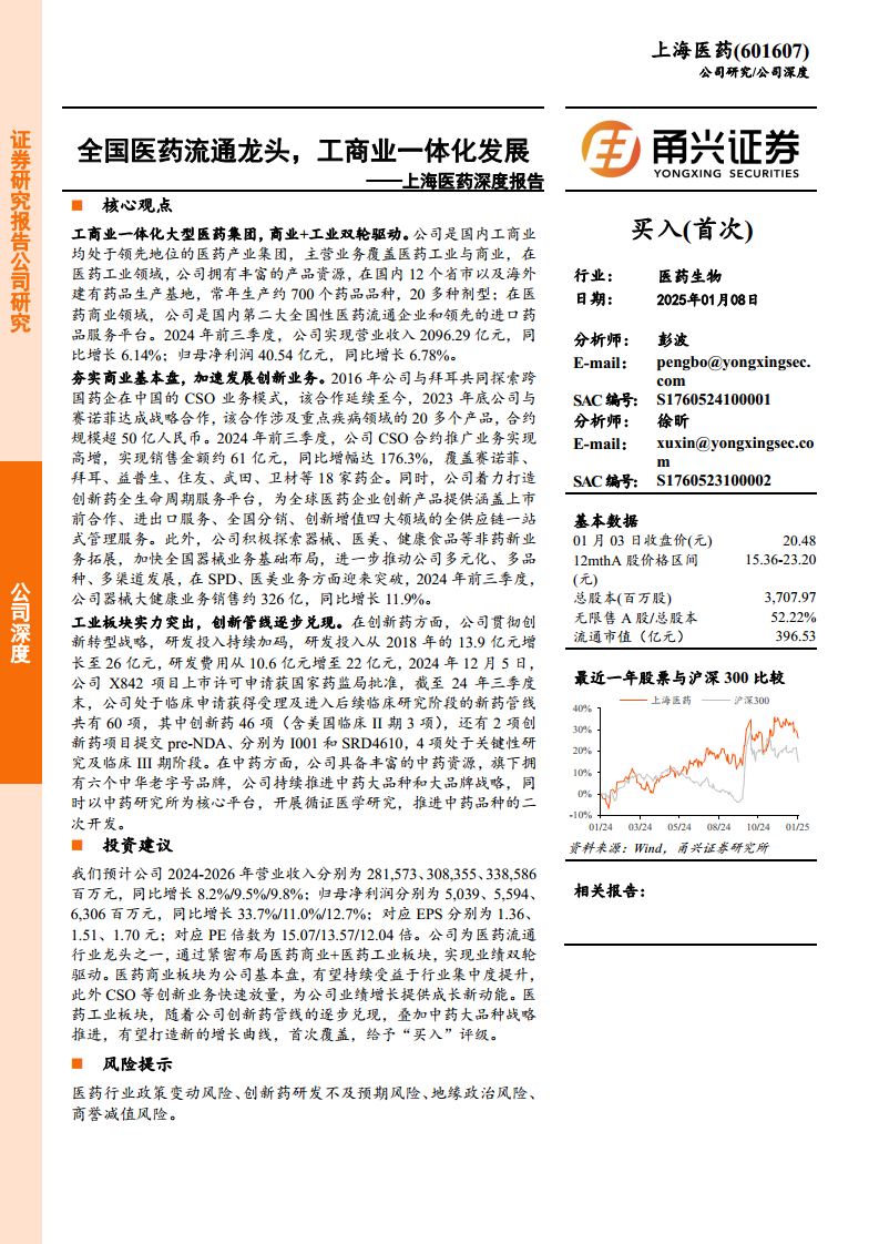 展望未来,我们预计公司2024-2026年营业收入将分别达到2815.73亿元、3083.55亿元和3385.86亿元,归母净利润将分别达到50.39亿元、55.94亿元和63.06亿元,对应每股收益分别为1.36元、1.51元和1.70元。公司在医药流通行业集中度提升的背景下,其商业基本盘将持续受益,而创新业务的快速放量和工业板块创新药及中药战略的逐步兑现,将共同驱动公司业绩实现双轮增长。首次覆盖给予“买入”评级,但投资者仍需关注医药行业政策变动、创新药研发不及预期、地缘政治及商誉减值等潜在风险。