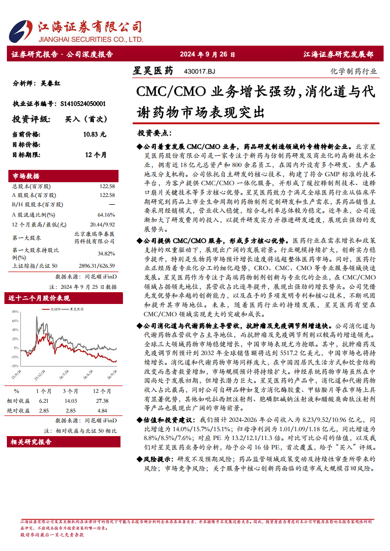 我们预计2024-2026年公司收入分别为8.23/9.52/10.96亿元,同比增速为14.0%/15.7%/15.1%;归母净利润分别为1.01/1.09/1.18亿元,同比增速为8.8%/8.5%/7.6%;对应PE为13.2/12.1/11.3倍。对比可比公司(圣诺生物、苑东生物、汇宇制药)2024-2026年平均PE分别为24.12、18.74、15.13倍,结合对星昊医药业务的分析,给予公司16倍PE,首次覆盖,给予“买入”评级。