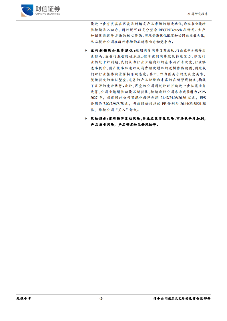 爱美客在2024年实现了营收和净利润的稳健增长,但第四季度业绩增速放缓,反映出市场环境的短期挑战。面对行业压力,公司积极通过内生研发创新和外延战略并购(如收购韩国REGEN Biotech,Inc.)来巩固市场地位并拓展国际业务,持续丰富产品管线,强化核心竞争力。尽管医美行业短期内面临消费复苏疲软和竞争加剧的压力,但长期来看,行业渗透率提升、国产化加速以及消费频次增加的趋势不变,为爱美客提供了坚实的增长基础。财信证券基于公司强大的竞争优势、完善的产品矩阵和持续的增长动能,维持其“买入”评级,并预测未来三年业绩将持续增长,看好公司长期发展潜力。