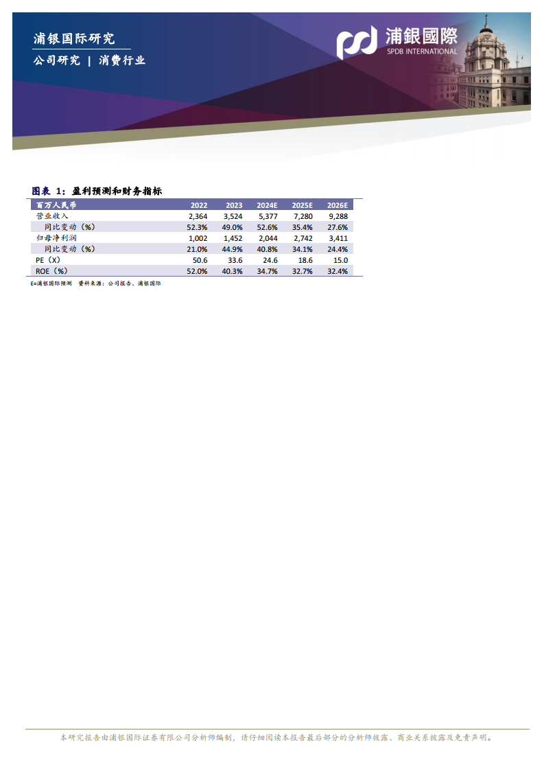 根据浦银国际的盈利预测,巨子生物的财务表现预计将持续强劲。公司营业收入预计从2022年的2,364百万元人民币增长至2026年的9,288百万元人民币,年复合增长率显著。具体来看,2024年预计营业收入达到5,377百万元人民币,同比增长52.6%;2025年预计为7,280百万元人民币,同比增长35.4%;2026年预计为9,288百万元人民币,同比增长27.6%。归母净利润方面,预计从2022年的1,002百万元人民币增长至2026年的3,411百万元人民币。2024年预计归母净利润为2,044百万元人民币,同比增长40.8%;2025年预计为2,742百万元人民币,同比增长34.1%;2026年预计为3,411百万元人民币,同比增长24.4%。这些数据表明,尽管增速可能在未来几年有所放缓,但公司仍将保持健康的盈利增长。在估值方面,预计PE(市盈率)将从2024年的24.6倍逐步下降至2026年的15.0倍,显示出公司估值吸引力的提升。同时,ROE(净资产收益率)预计在2024-2026年间保持在32%以上的高水平,反映了公司高效的资本利用能力。