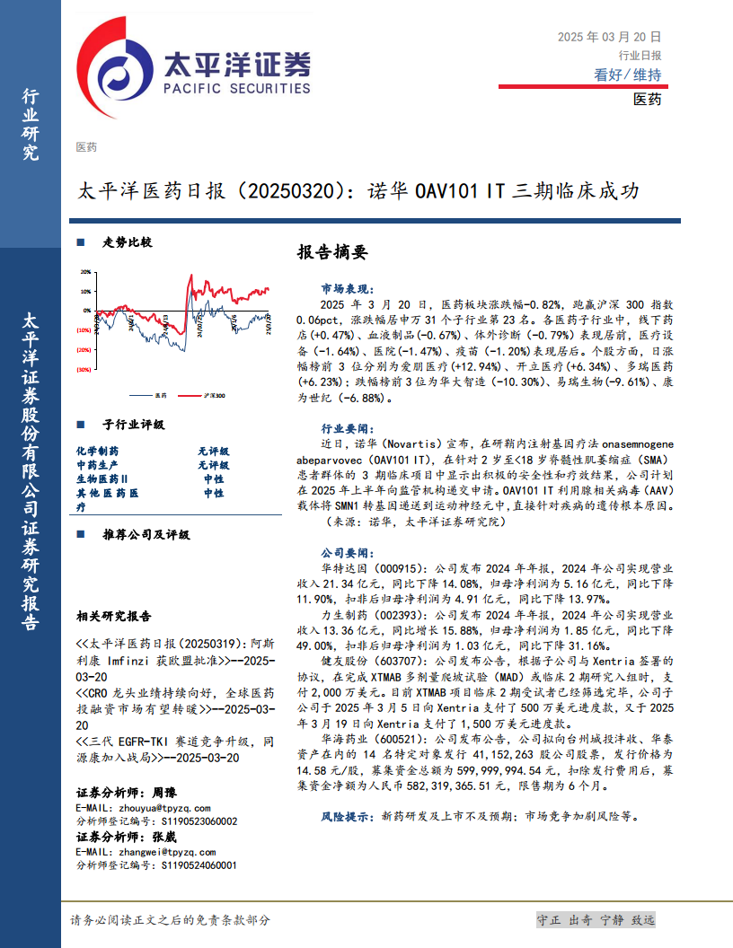 本报告分析了2025年3月20日医药行业的市场表现、重大行业新闻及重点公司动态。市场方面,医药板块整体跑赢大盘,但内部子行业和个股表现分化显著。行业要闻的亮点是诺华SMA基因疗法OAV101 IT三期临床的成功,预示着该领域可能迎来突破。公司层面,华特达因和力生制药的2024年业绩呈现营收或利润的下降,而健友股份和华海药业则分别在研发投入和股权融资方面有重要进展。报告同时提示了新药研发及上市不及预期、市场竞争加剧等风险。