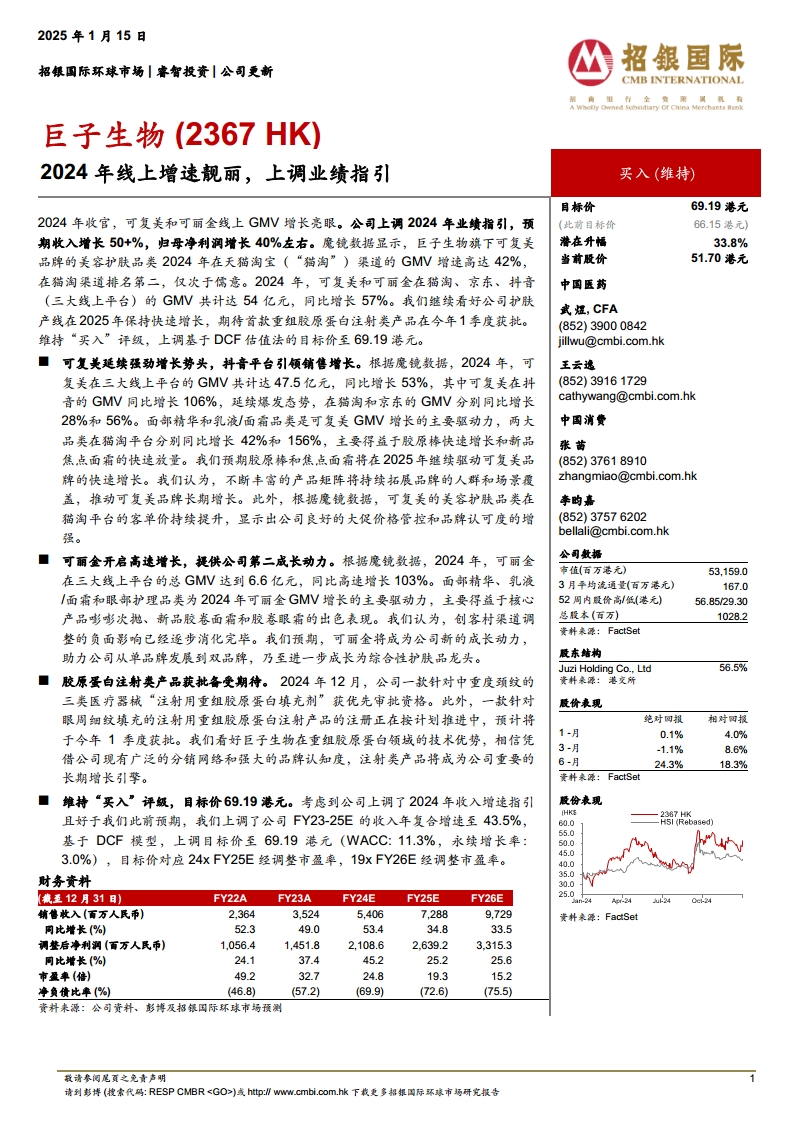 巨子生物在2024年取得了显著的线上销售业绩,核心品牌可复美和可丽金在电商平台实现强劲增长,特别是抖音渠道表现突出。公司因此上调了2024年收入和净利润的业绩指引,显示出其强大的市场竞争力和品牌运营能力。可丽金的崛起标志着公司双品牌战略的成功,为未来增长提供了新的动力。同时,重组胶原蛋白注射类产品的即将获批,预示着公司在医疗美容领域将开辟新的增长空间。基于对公司基本面和未来增长潜力的积极评估,招银国际维持“买入”评级,并上调了目标价,反映了市场对其持续增长的信心。