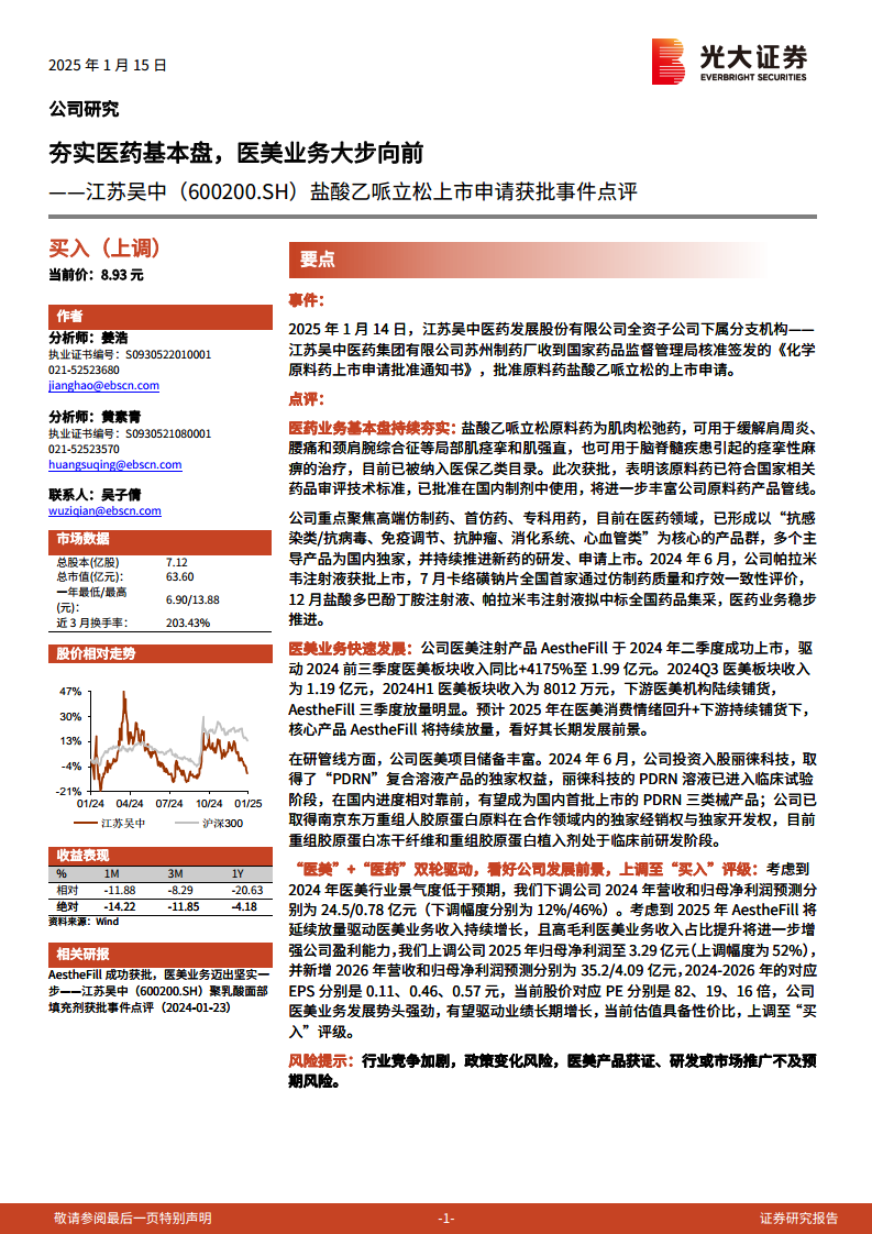 本报告核心观点指出,江苏吴中(600200.SH)正通过“医药”与“医美”双轮驱动战略,持续巩固其市场地位并实现业绩增长。医药业务通过新药获批和仿制药一致性评价不断夯实基本盘,而医美业务则凭借核心产品AestheFill的成功上市和放量,展现出强劲的增长势头。