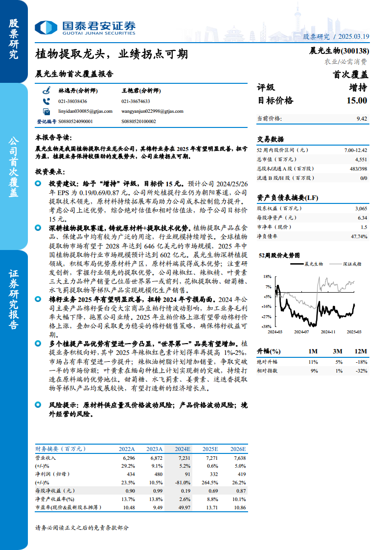 国泰君安证券首次覆盖晨光生物,给予“增持”评级,目标价15元。预计公司2024/25/26年EPS分别为0.19/0.69/0.87元。该预测基于棉籽业务在2025年有望实现盈利,以及植提业务(包括色素、香辛料、营养等)大单品销量稳健增长和高毛利率梯队产品快速发展的假设。通过FCFF绝对估值法和可比公司相对估值法(给予2025年22倍PE估值),综合得出目标价15元。