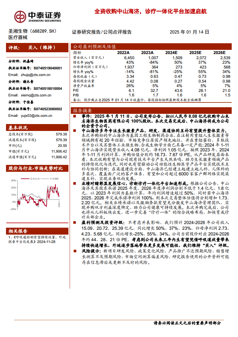 圣湘生物通过全资收购中山海济,成功拓展了其在儿科诊疗领域的战略布局,并有望通过研发和渠道的深度协同,加速实现“诊断+治疗”一体化战略的落地。本次收购的业绩对赌机制为公司未来的业绩增长提供了保障和激励,增强了市场对公司发展的信心。尽管公司在2023-2024年面临利润波动,但预计未来几年将凭借内生业务的持续放量和外延并购的驱动,实现盈利能力的恢复和市场竞争力的持续提升。综合来看,分析师维持“买入”评级,但投资者仍需关注报告中提及的各项潜在风险。