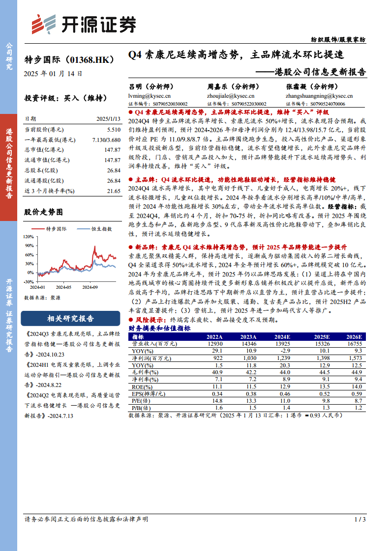 特步主品牌在功能性跑鞋的驱动下,经营指标保持稳健,库销比和折扣水平持续优化。同时,索康尼作为集团的第二增长曲线,正处于品牌升级的关键阶段,通过在渠道、产品和营销方面的战略性投入,预计将进一步提升品牌势能并贡献显著的收入增长。公司整体战略聚焦于提升品牌价值和市场份额,通过精细化运营和多品牌协同发展,为投资者提供了清晰的增长路径和价值创造潜力。