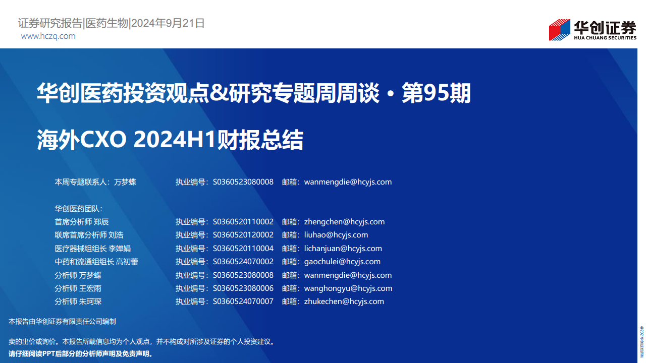 华创医药投资观点、研究专题周周谈第95期:海外CXO2024H1财报总结