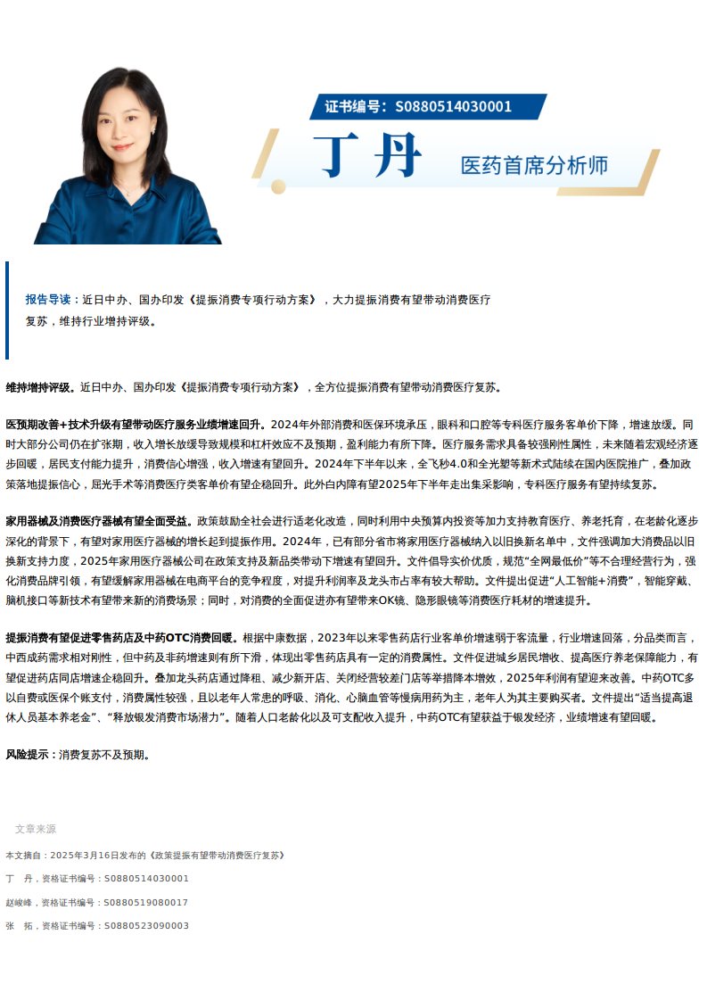 中办、国办印发的《提振消费专项行动方案》为消费医疗行业注入强劲增长动力,预计将带动医疗服务、家用及消费医疗器械、零售药店及中药OTC等多个细分领域实现业绩回升。