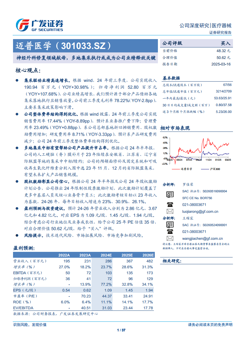 迈普医学作为神经外科修复再生领域的领军企业,其核心观点在于通过积极响应国家带量采购政策,成功驱动了公司业绩的高速增长。2024年前三季度,公司实现收入190.94百万元,同比增长30.98%;归母净利润52.80百万元,同比大幅增长107.68%,这主要得益于部分产品在各地集采落地后的销售放量。尽管集采政策导致毛利率略有下滑至78.22%(同比下降2.8个百分点),但公司通过优化费率结构,实现了销售费用率同比下降8.89个百分点至17.44%,研发费用率同比下降3.33个百分点至8.71%,从而有效提升了整体盈利能力。此外,多地集采中标不仅提升了公司产品的市场占有率,也为未来业绩持续释放奠定了基础。