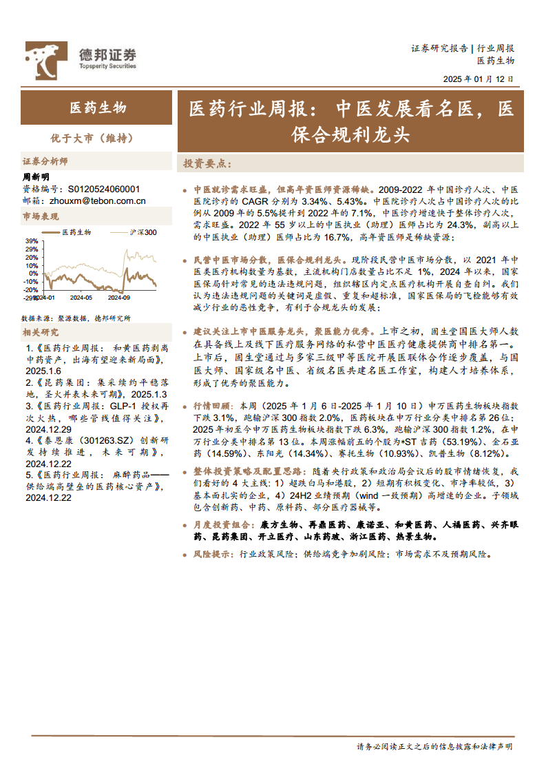 本报告深入分析了医药生物行业的最新动态与发展趋势,特别是对中医服务市场进行了详细剖析。报告指出,中医诊疗需求持续增长,但高年资医师资源稀缺是行业面临的核心挑战。同时,国家医保局加强合规监管,将促使民营中医市场加速整合,有利于合规性强的龙头企业脱颖而出。固生堂等上市中医服务龙头凭借其优秀的医师聚合能力,有望在市场竞争中占据优势。