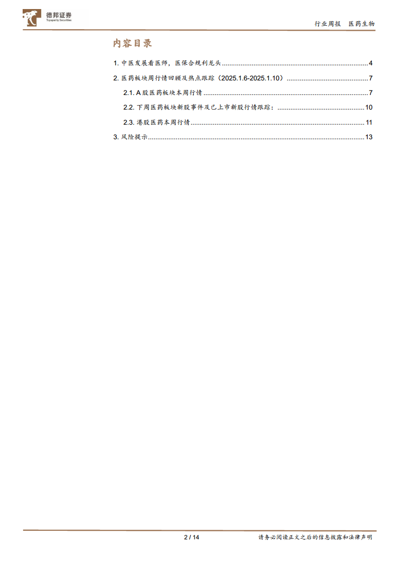 本周(2025年1月6日至2025年1月10日),港股恒生医疗保健指数下跌2.7%,但较恒生指数跑赢0.8%。2025年初至今,恒生医疗保健指数累计下跌6.1%,较恒生指数跑输1.1%。在港股医药板块的210支个股中,38支上涨,146支下跌,26支持平。涨幅前五的个股包括兴科蓉医药(36.4%)、位元堂(18.0%)、和铂医药-B(15.9%)、百信国际医疗(12.8%)和腾盛博药-B(11.2%)。