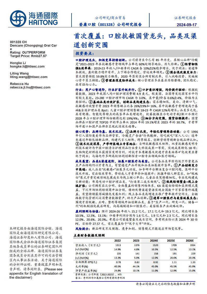 - 登康口腔前身可追溯至1939年,核心品牌“冷酸灵”自1987年上市以来,在抗敏感牙膏领域市占率达60%,居领导地位。
