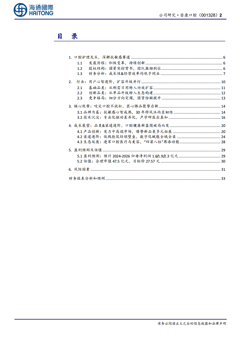 登康口腔作为中国抗敏感牙膏市场的领导者,凭借其深厚的品牌积淀、持续的技术创新和高效的运营管理,在口腔护理行业中展现出强大的竞争力和增长潜力。公司通过优化产品结构,发力中高端市场,积极拓展儿童和电动口腔护理等新兴品类,并战略性地向口腔医疗与美容服务领域延伸,构建了多元化的产品矩阵和“口腔大健康”生态蓝图。在渠道方面,公司通过深耕低线经销市场建立壁垒,同时加速线上全域扩张,有效提升了市场覆盖深度和广度。尽管面临新品研发、市场竞争和销售模式适应性等风险,但鉴于其稳固的龙头地位、清晰的成长路径和行业扩容升级的有利趋势,登康口腔有望持续实现业绩增长和市场份额提升。预计未来三年公司收入和归母净利润将保持稳健增长,具备“优于大市”的投资价值。