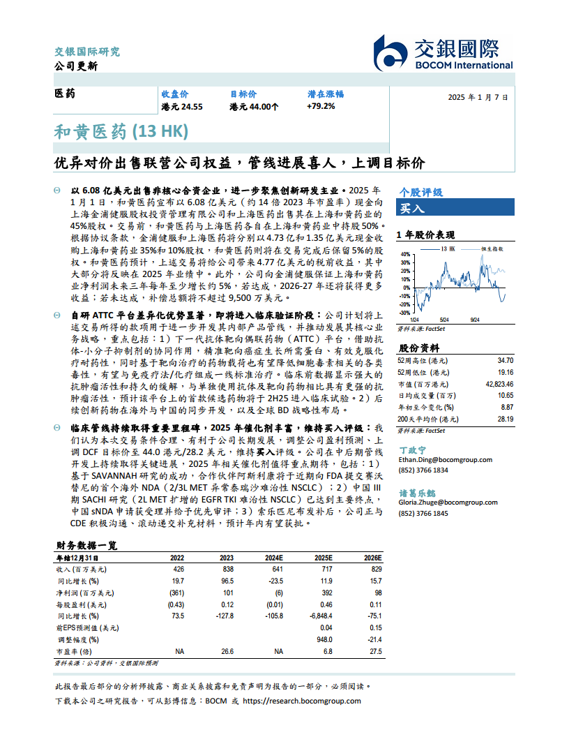 交易细节与财务影响: 和黄医药于2025年1月1日宣布,以6.08亿美元现金(约14倍2023年市盈率)向上海金浦健服股权投资管理有限公司和上海医药出售其在上海和黄药业45%的股权。交易前,和黄医药与上海医药各自在上海和黄药业中持股50%。根据协议条款,金浦健服和上海医药将分别以4.73亿和1.35亿美元现金收购上海和黄药业35%和10%股权,和黄医药则将在交易完成后保留5%的股权。公司预计,此交易将带来4.77亿美元的税前收益,其中大部分将反映在2025年业绩中。此外,公司向金浦健服保证上海和黄药业净利润未来三年每年至少增长约5%,若达成,2026-27年还将获得更多收益;若未达成,补偿总额将不超过9,500万美元。