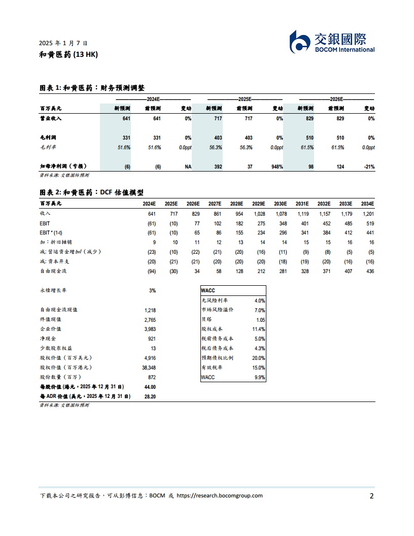 目标价与评级: 基于优化的财务前景和DCF估值模型,交银国际将和黄医药的目标价从之前的水平上调至44.0港元(或28.2美元),较当前股价24.55港元有79.2%的潜在涨幅。维持“买入”评级,反映了分析师对公司未来业绩增长和市场表现的强烈信心。DCF模型关键参数包括9.9%的加权平均资本成本(WACC)和3%的永续增长率,计算得出企业价值为39.83亿美元,股权价值为49.16亿美元。