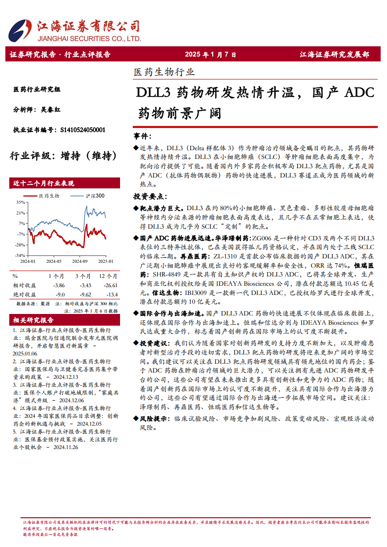 医药生物行业:DLL3药物研发热情升温,国产ADC药物前景广阔