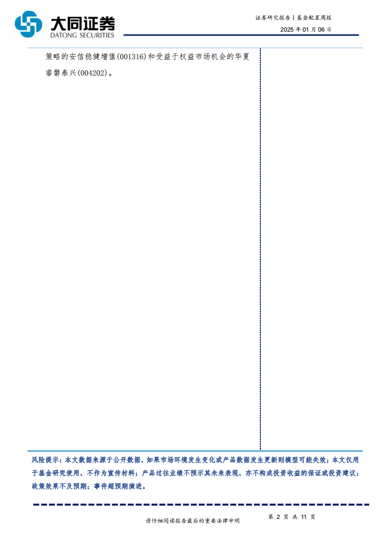 本周报对2024年末至2025年初的市场进行了全面回顾与分析,指出权益市场整体下行而债券市场逆势走强,基金市场表现也随之分化。在基金配置策略上,报告强调了政策驱动的重要性,建议投资者关注医药、数据产业和新能源等受政策利好的领域,并通过“红利后卫、均衡中场、科技前锋”的策略提升权益类产品的配置弹性。对于稳健类产品,鉴于央行可能降准降息以及国债收益率持续下行,建议投资者调整短债基金的收益预期,并积极配置固收+基金和具有配置价值的可转债产品。报告同时提示了市场波动、政策效果不及预期等风险,强调投资决策需谨慎。