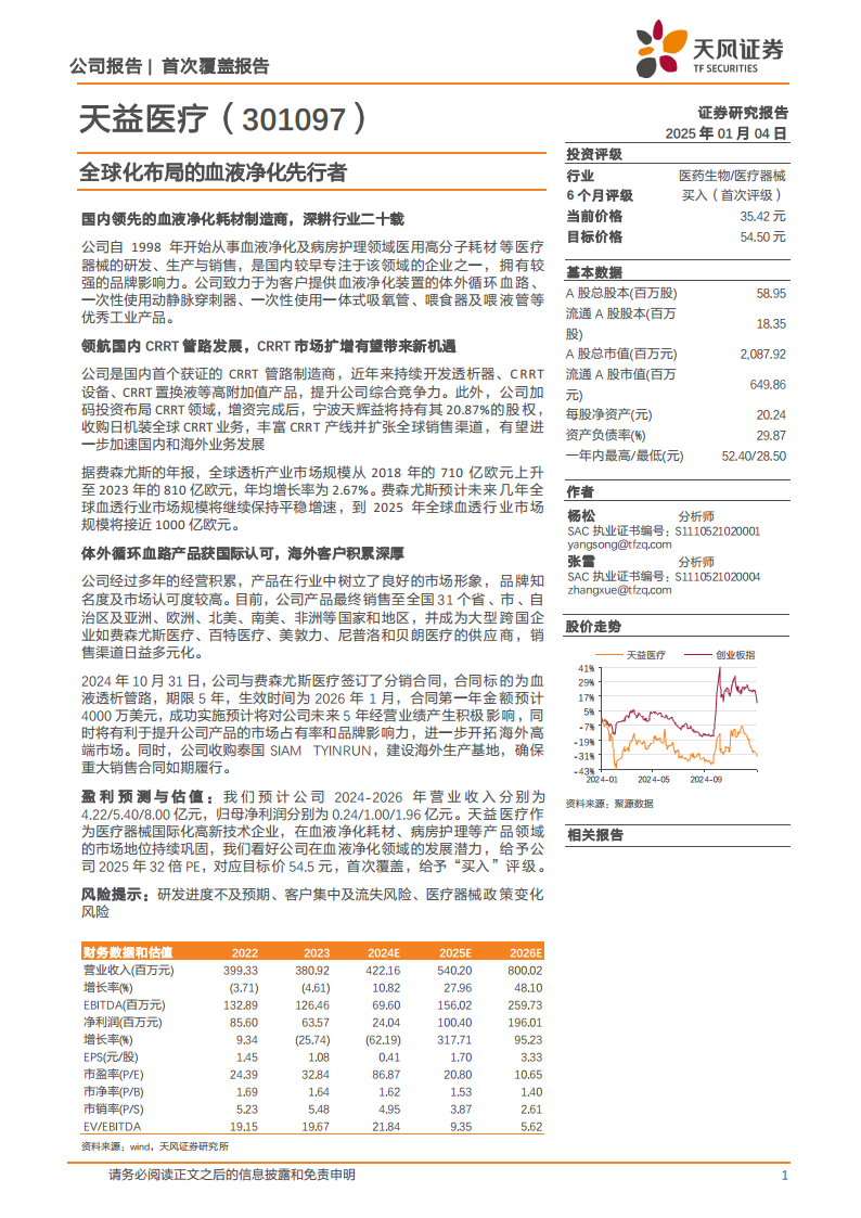 天益医疗作为中国首个CRRT管路制造商,在国内体外循环血路市场地位领先,积极布局全产品线,加强新产品研发,且与海外客户合作关系长期稳定,合作金额稳步上升。鉴于公司进入加速发展阶段,天风证券给予公司2025年32倍PE,对应目标价54.50元,首次覆盖给予“买入”评级。