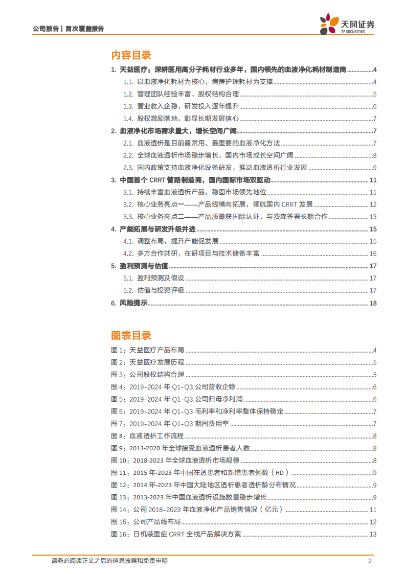 基于血液净化市场快速增长、公司产品线丰富、研发能力加强、生产基地和在研项目进展顺利,以及与费森尤斯医疗的长期合作协议(首年供货金额4000万美元,自2026年1月生效且有望逐年提升),天风证券预计公司2024-2026年营业收入分别为4.22亿元、5.40亿元和8.00亿元,归母净利润分别为0.24亿元、1.00亿元和1.96亿元。