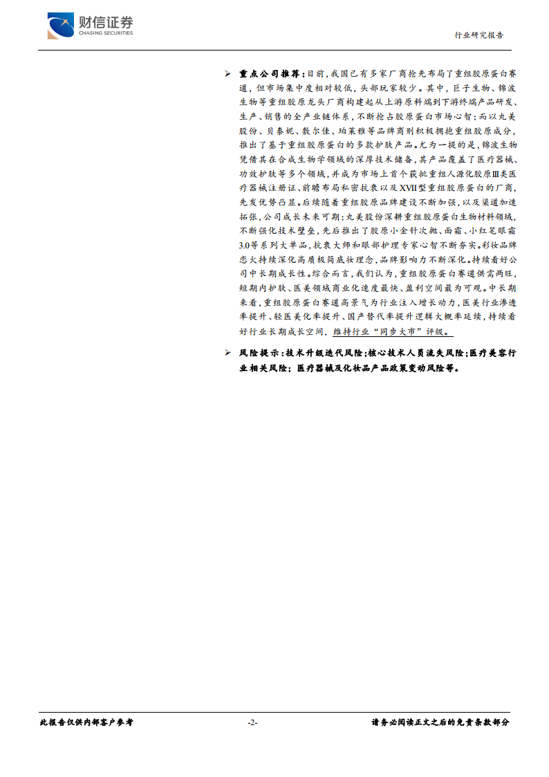 综合来看,重组胶原蛋白赛道供需两旺,短期内护肤和医美领域商业化速度最快、盈利空间最为可观。中长期来看,医美行业渗透率提升、轻医美化率提升、国产替代率提升的逻辑将持续,为行业注入强劲增长动力。本报告维持行业“同步大市”评级,并持续看好行业长期成长空间。投资者应关注技术升级迭代、核心技术人员流失、医疗美容行业政策变动等潜在风险。